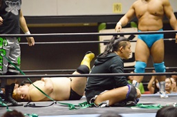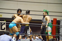 この試合はノータッチルール。先発はMIKAMI、高尾、ウラノ、伊橋。MIKAMIと高尾ロックアップ、高尾がMIKAMIにヘッドロック(左写真)、