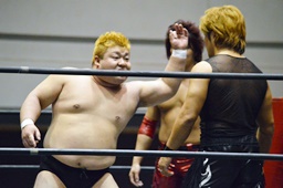 MIKAMIがコーナーからダイビングチョップ(左写真)、デュランダル。