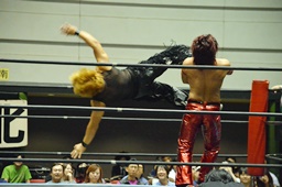 内田コーナーに上ってダイビングボディプレス(右写真)、カウント2。5分経過。