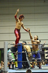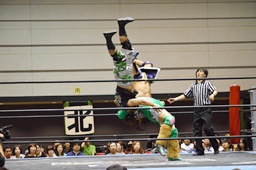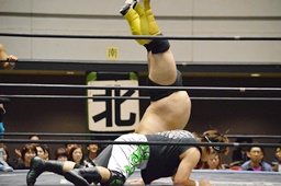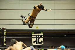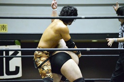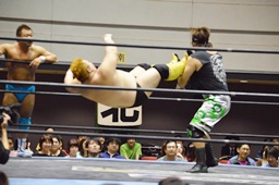 ウラノが伊橋を抱え上げる、高尾が伊橋の背中にミサイルキック(右写真)、押しつぶす。