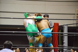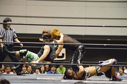入江ウラノと彰人をまとめてブレーンバスター(左写真)、そこに伊橋がボディプレス、カウント2。