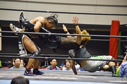 MIKAMIドロップキック(右写真)、高尾もすぐにドロップキックで返す。