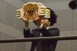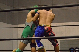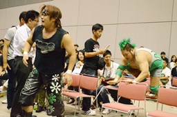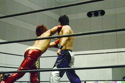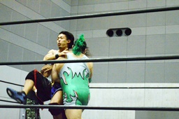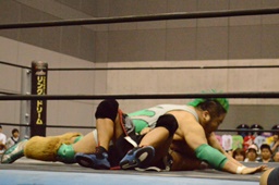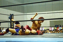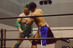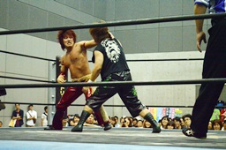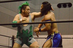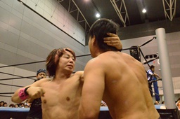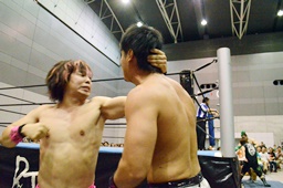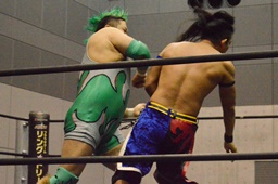 高尾ボディスラム狙う、彰人ブロックして逆にボディスラム(左写真)、HARASHIMAにタッチ。