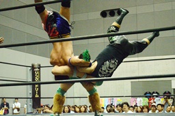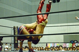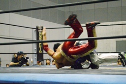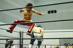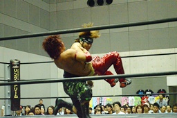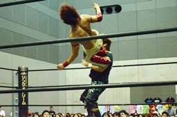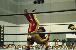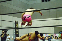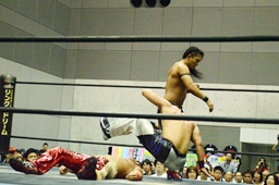 入江ボディスラム、ロープに飛んでランニングボディプレス(右写真)、ウラノがカット。入江は石井にタッチ。