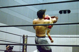 ウラノ入ってダブルのブレーンバスター狙うが入江は2人を逆に投げる(左写真)。10分経過。