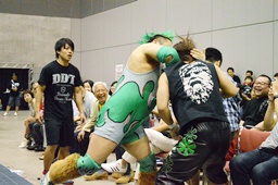 石井場外でバックドロップ狙う、HARASHIMAブロック(右写真)。