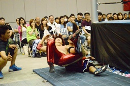 イスにつまづいて転倒(左写真)。ウラノ入江をリングに戻してカバー。彰人にタッチ。