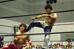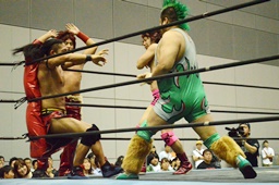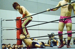 ドロップキック(左写真)。入江とウラノにタッチ。