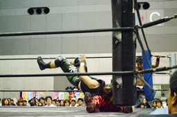 ウラノロープに飛ぶ、高尾ドロップキック、ウラノロープにつかまってスカす。ウラノロープに飛ぶ、高尾前転から再度ドロップキック(右写真)、入江にタッチ。ウラノも彰人にタッチ。