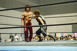 HARASHIMAガットショット、ヘッドロック、高尾ロープに振る、HARASHIMAショルダーブロック。HARASHIMAロープに飛ぶ、高尾リープフロッグでかわし(右写真)、