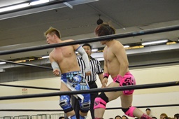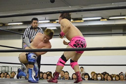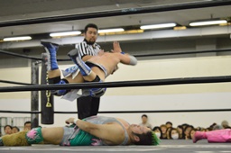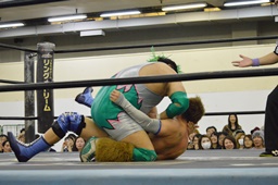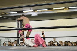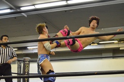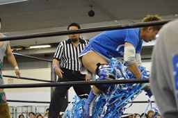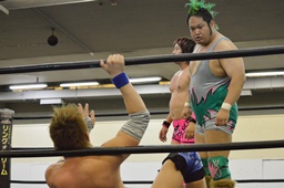 入江はボディスラム、スライディング式ボディプレス3連発(左写真)、カウント2。石井にタッチ。斗猛矢は入江の激しすぎる攻撃を見て大石に「とりあえず謝っとこう?」とアドバイス。