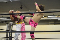 大石ミラクルエクスタシー狙う、入江逆にノド輪落としに行こうとするが大石はホイップで切り返す(左写真)。