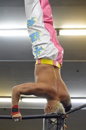 石井が斗猛矢をコーナーに振る、斗猛矢コーナーで倒立(右写真)、