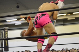 斗猛矢石井の背中の上で回転、起き上がってエルボードロップ(右写真)。大石にタッチ。
