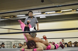 入江ビーストボンバー、大石一回はかわすが入江はロープの間を往復してビーストボンバー決める(左写真)、カウント3。