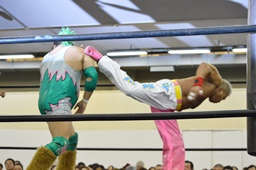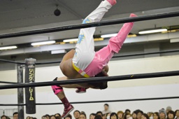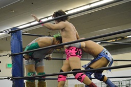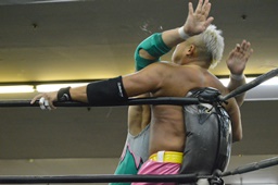 石井入って入江と2人で大石を背中からターンバックルに(右写真)。石井サマーソルトドロップ、カウント2。