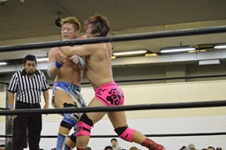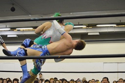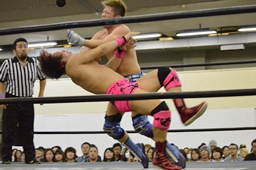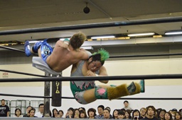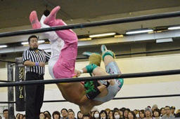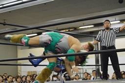 斗猛矢コーナーに上って雪崩式ブレーンバスター(右写真)、大石にタッチ。