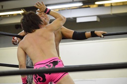斗猛矢はリングインすると石井にショルダーブロック、入江にはバックエルボー(左写真)。