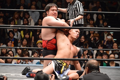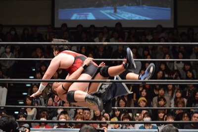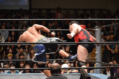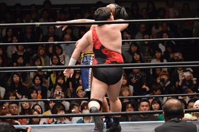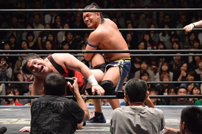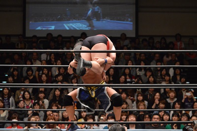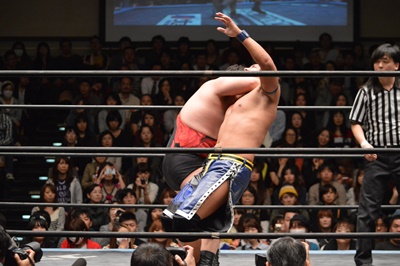 彰人コーナーに振る、アントン切り返す、彰人突っ込んでくる、アントンはカウンターのテーズプレス(左写真)、