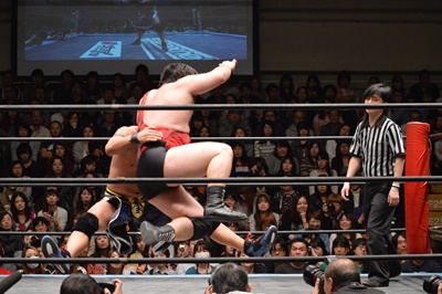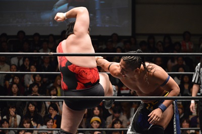 彰人アントンの足をすくって倒しヒザにドロップキック(右写真)。