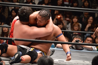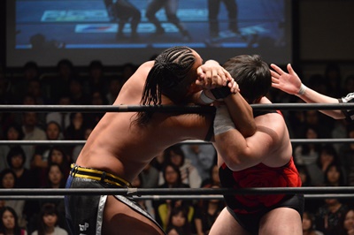 彰人マフラーホールド狙う、アントンパンチでブロック(右写真)、
