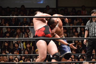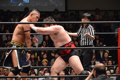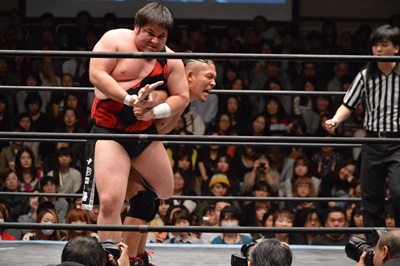 彰人が入場してにらみ合い(右写真)。この試合はオンリーギブアップルール。