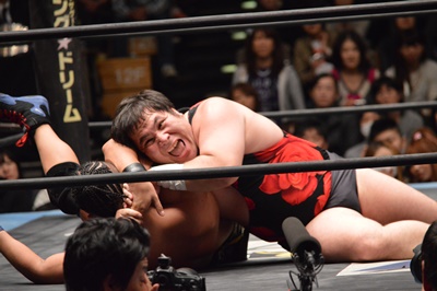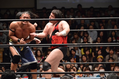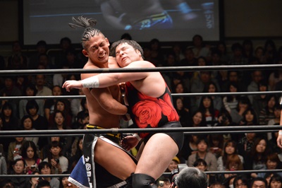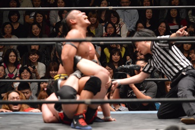 彰人はアントンの足をロープに引っ掛けて攻める(左写真)、