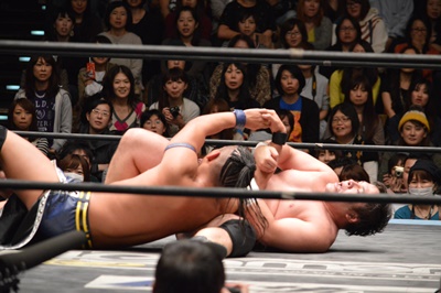 彰人ニークラッシャー狙う、アントンワキ固めに切り返す(右写真)。