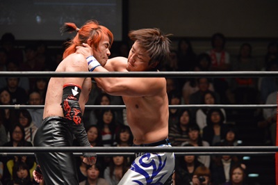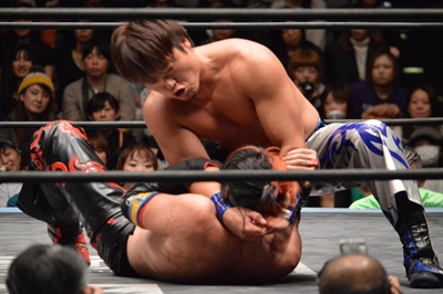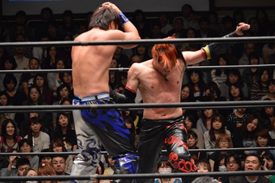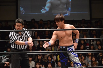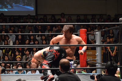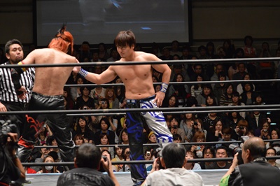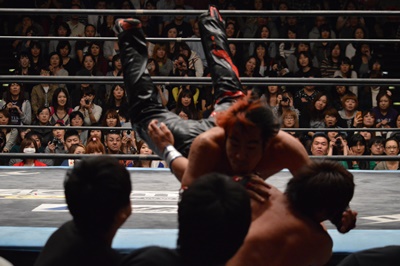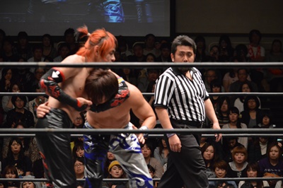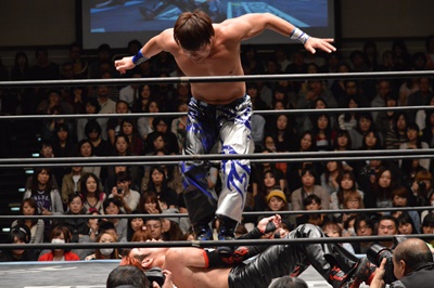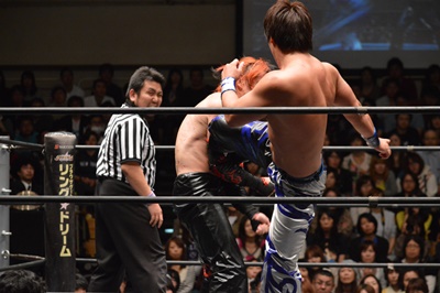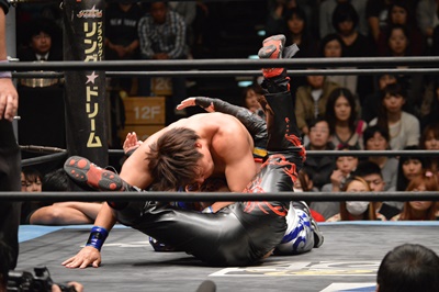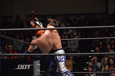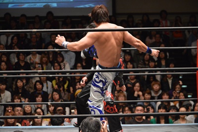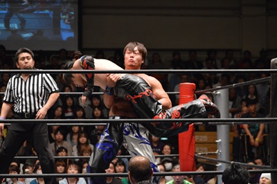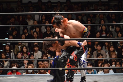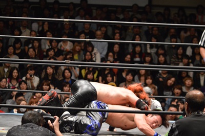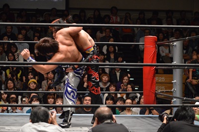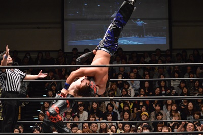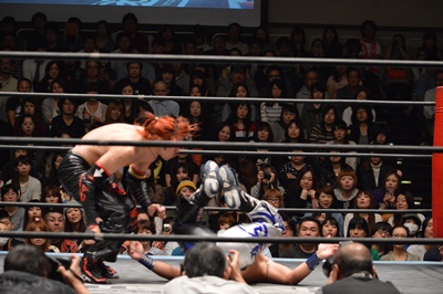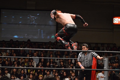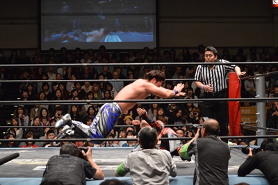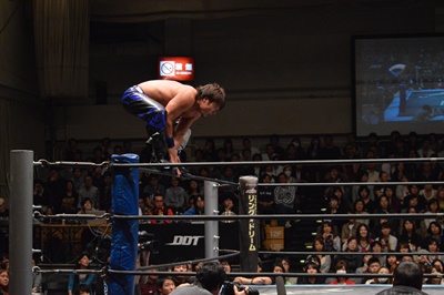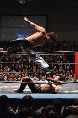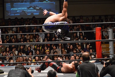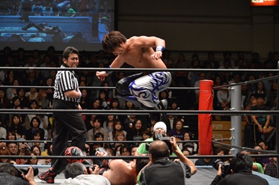 イサミコーナーに上ってダイビングクロスボディ(右写真)、HARASHIMAは山折りの形で受ける。