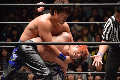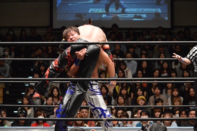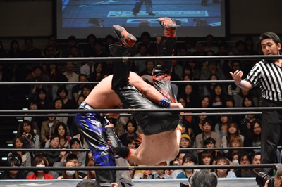 ブレーンバスター、HARASHIMAブロックするがイサミ投げ切る(左写真)、カウント2。