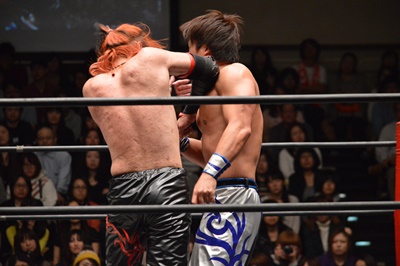 エルボーの打ち合いからイサミは「ボディがお留守だぜ!」(右写真)