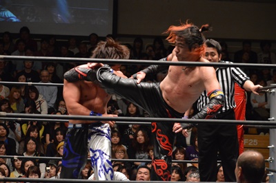 HARASHIMAビッグブーツ、ロープに飛ぶ、イサミカウンターのドロップキック(左写真)。