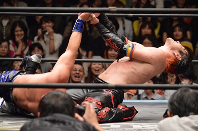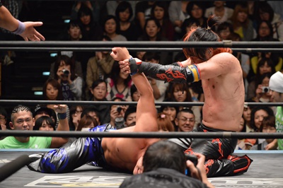 あえて受けに出たイサミにダブルニードロップ(左写真)。5分経過。