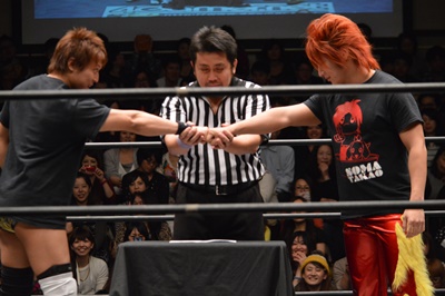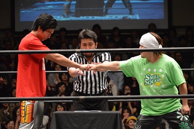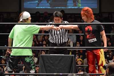 高尾がパーで勝ち(右写真)。決勝はヤス・ウラノvs高尾蒼馬。ウラノが勝てばスマイルスカッシュ対決、高尾が勝てば2011/6/19に石川修司に挑戦して以来の久々の挑戦、HARASHIMAには初挑戦。