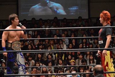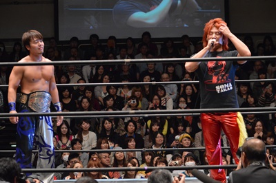 HARASHIMA「今から緊張してどうすんだよ?高尾もね、いろんな団体出て強くなってるよ。じゃんけんに勝ったということは運もあるよ。でもね、僕の方がもっともっと強いんだよ。11月のタイトルマッチ、楽しみにしてるよ。」(左写真)