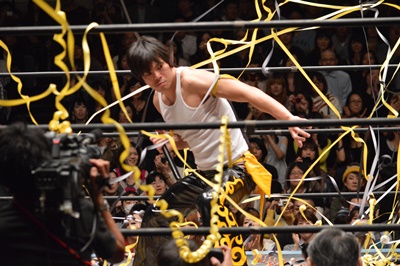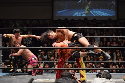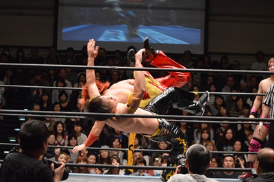 KUDOコーナーに振って突っ込む、石井かわしてジャーマン(右写真)、高尾にタッチ。