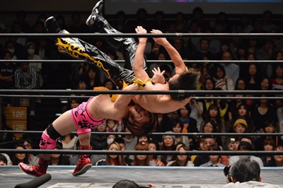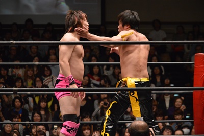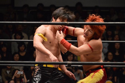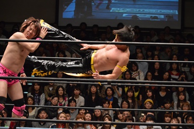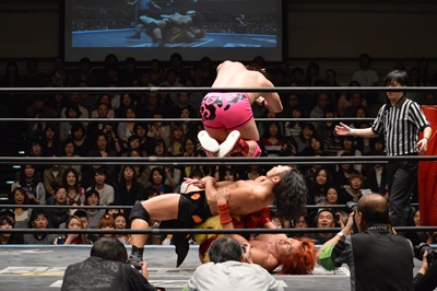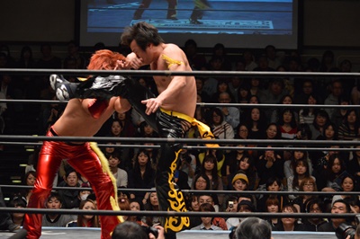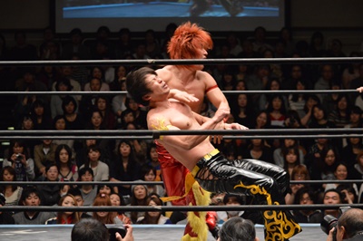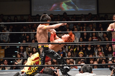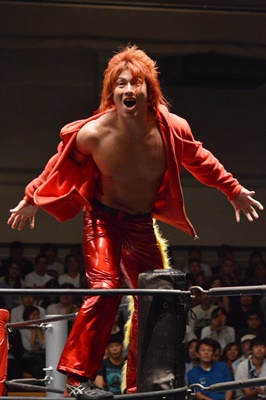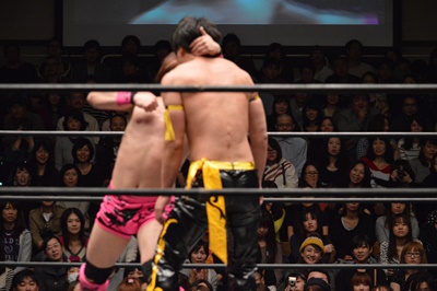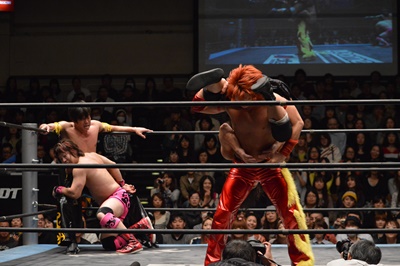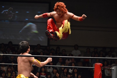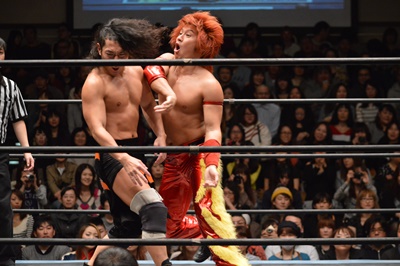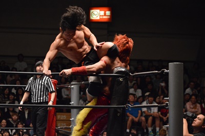 ロックアップ、KUDOヘッドロック、高尾ロープに飛ぶ、KUDOショルダーブロック(右写真)。