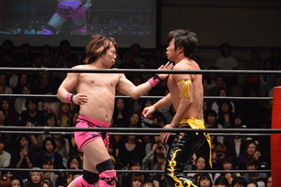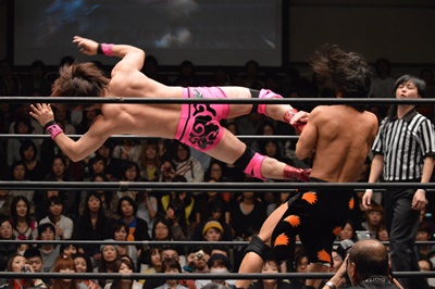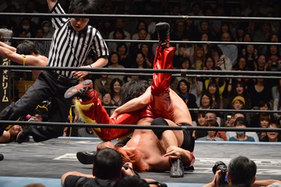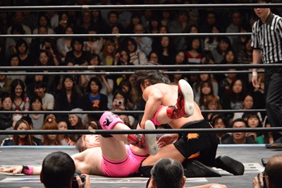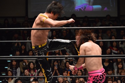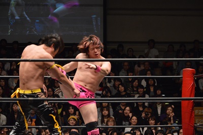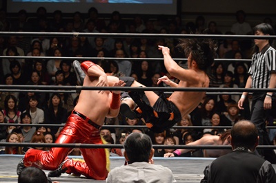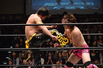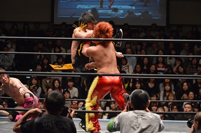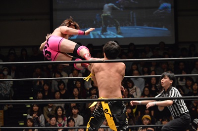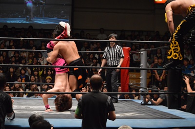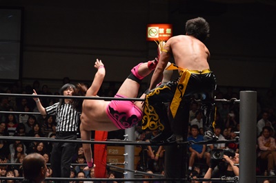 KUDOバックスピンキック、高尾ブロック(右写真)、ロープに飛ぶ、KUDOヒザ蹴り、高梨にタッチ。