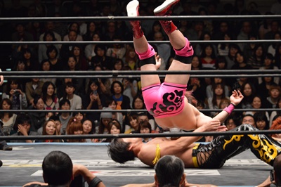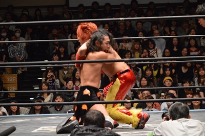 高尾が高梨にバッククラッカー、その上から石井がダブルニードロップ(右写真)。高尾トラースキック、KUDOカット。