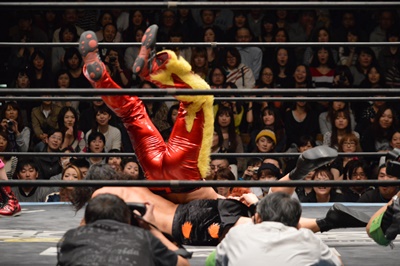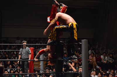 高尾コーナーに倒立して雪崩式フランケンシュタイナー(左写真)。