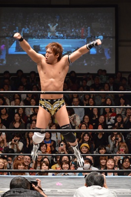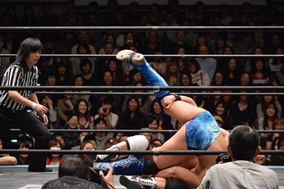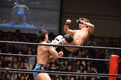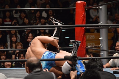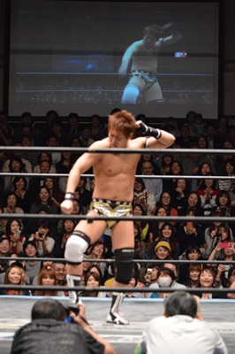 コーナーに上ってミサイルキック(右写真)、カウント2。