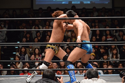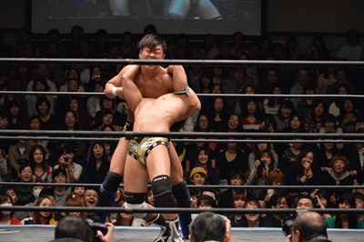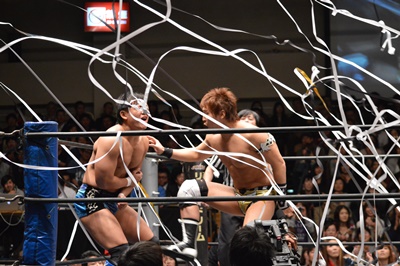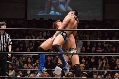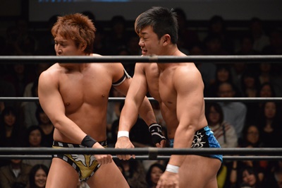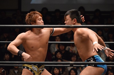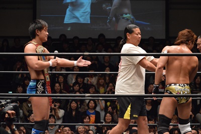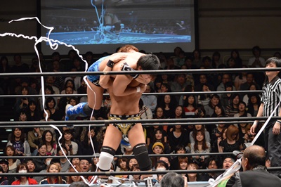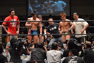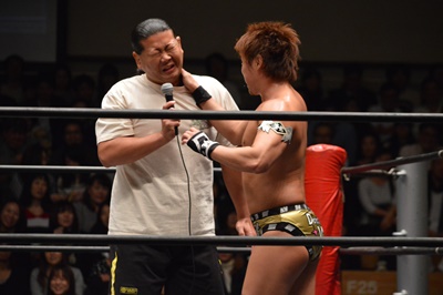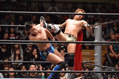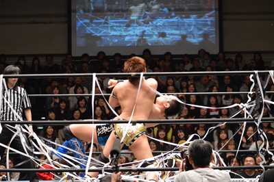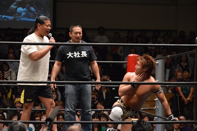 バタフライロック(左写真)、遠藤ロープ。セコンドの高木と大鷲がうるさい。平田思わず「うるさい!」