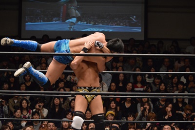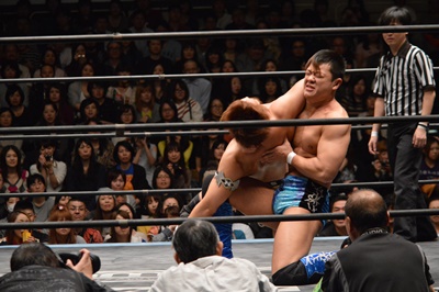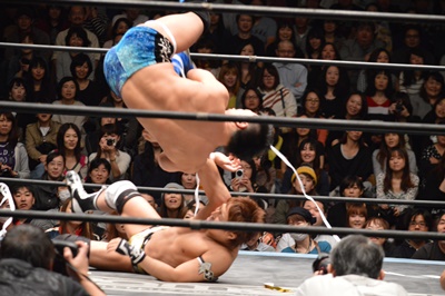平田ブレーンバスター狙う、遠藤ブロックして逆に投げる(右写真)。