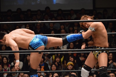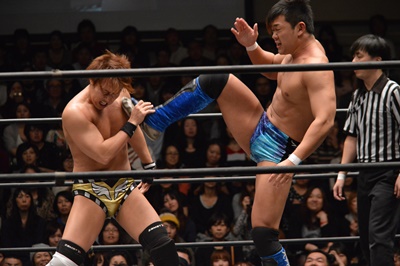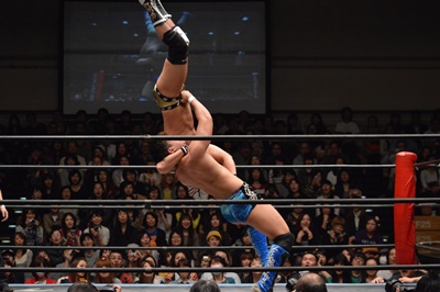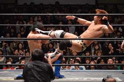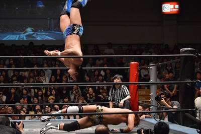 平田ロープに飛んでスライディングキック(右写真)、カウント2。