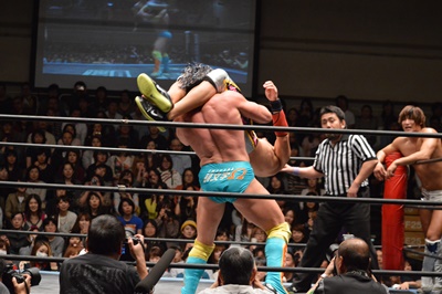 ケニーが竹下にダイビングクロスボディ(右写真)、カウント2。