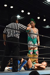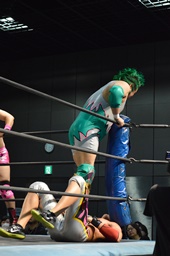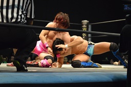 入江が入って竹下にチンロック、遠藤がカット(右写真)。石井と入江は遠藤をエプロンに出すと断崖式のツープラトンパイルドライバー。10分経過。