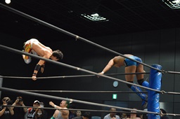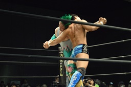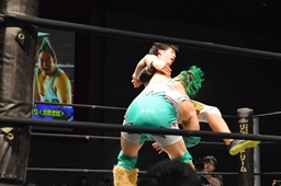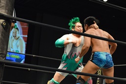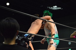 ロックアップ、竹下がヘッドロック、石井ロープに振る、竹下ショルダーブロック。竹下がぶる、石井コーナーに押し込んで入江にタッチ。ロックアップ、竹下ヘッドロック、入江ロープに振ってショルダーブロックの打ち合い、入江が打ち勝つ(右写真)。入江エルボー打ち込んで石井にタッチ。5分経過。