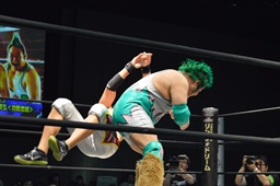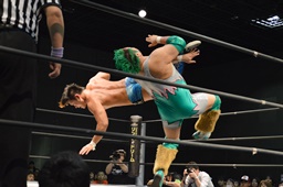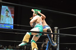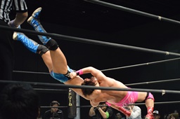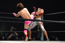 遠藤スワンダイブエルボー(右写真)、ビッグブーツからノーザンライトスープレックスホールド、カウント2。