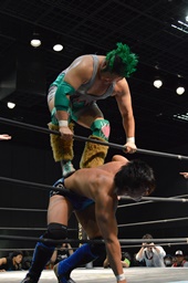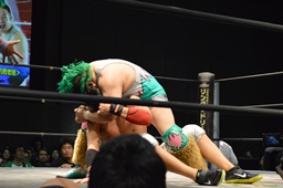 竹下エプロンからトペ・アトミコ。バックブリーカー(右写真)、カウント2。