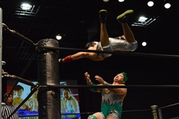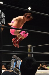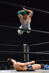 遠藤ボディスラム、コーナーに上ってムーンサルトプレス(右写真)、入江かわし遠藤着地。